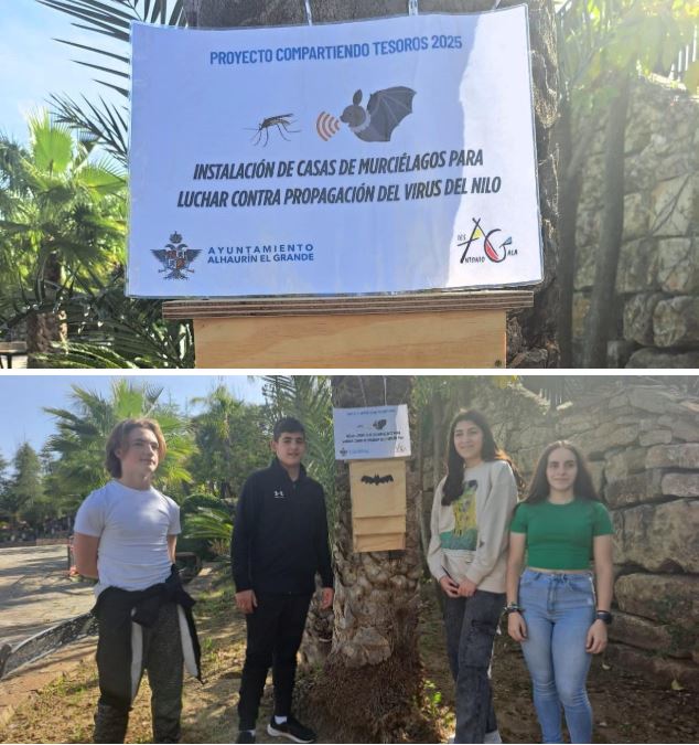 El IES Antonio Gala con la colaboración del área de Medio Ambiente del Ayuntamiento de Alhaurín el Grande, que coordina Teresa Sánchez, ha llevado a cabo un innovador proyecto: la elaboración de unas casetas para murciélagos con el objetivo de darles cobijo y contribuir así al control de plagas de mosquitos y otros insectos de forma natural. Esta mañana han colocado 12 de estas casetas en el parque de La Libertad.